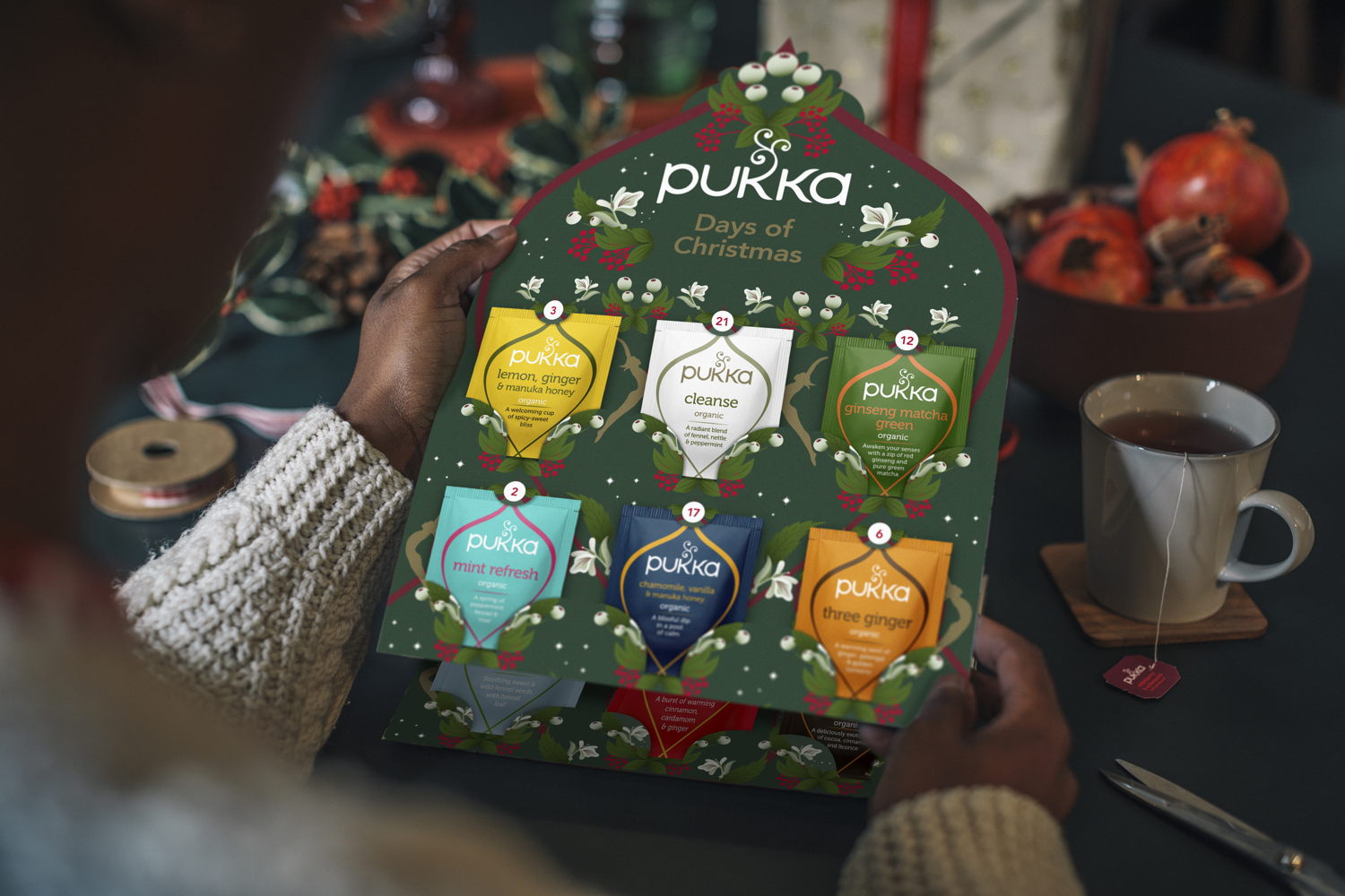 Fa-la-la, hoe lang nog tot Kerstmis? Nu de dagen korter en grijzer worden, maken we het binnen gewoon extra cosy. Dikke wollen truien en fluffy fleece dekens worden bovengehaald. We zakken wat dieper weg in de zetel en bingewatchen ongegeneerd kerstfilms. Op 1 december start de countdown tot kerst echt. En dat doen we met de adventskalender van theemerk Pukka: 24 hartverwarmende kopjes thee tot The Most Wonderful Time Of The Year!