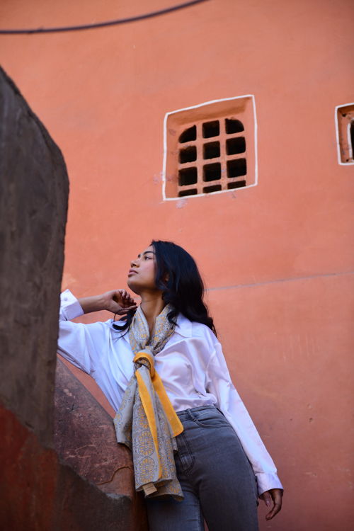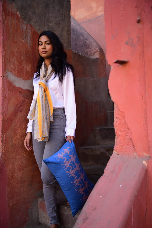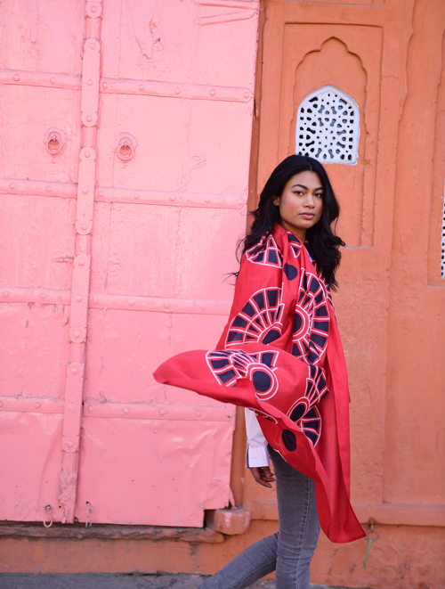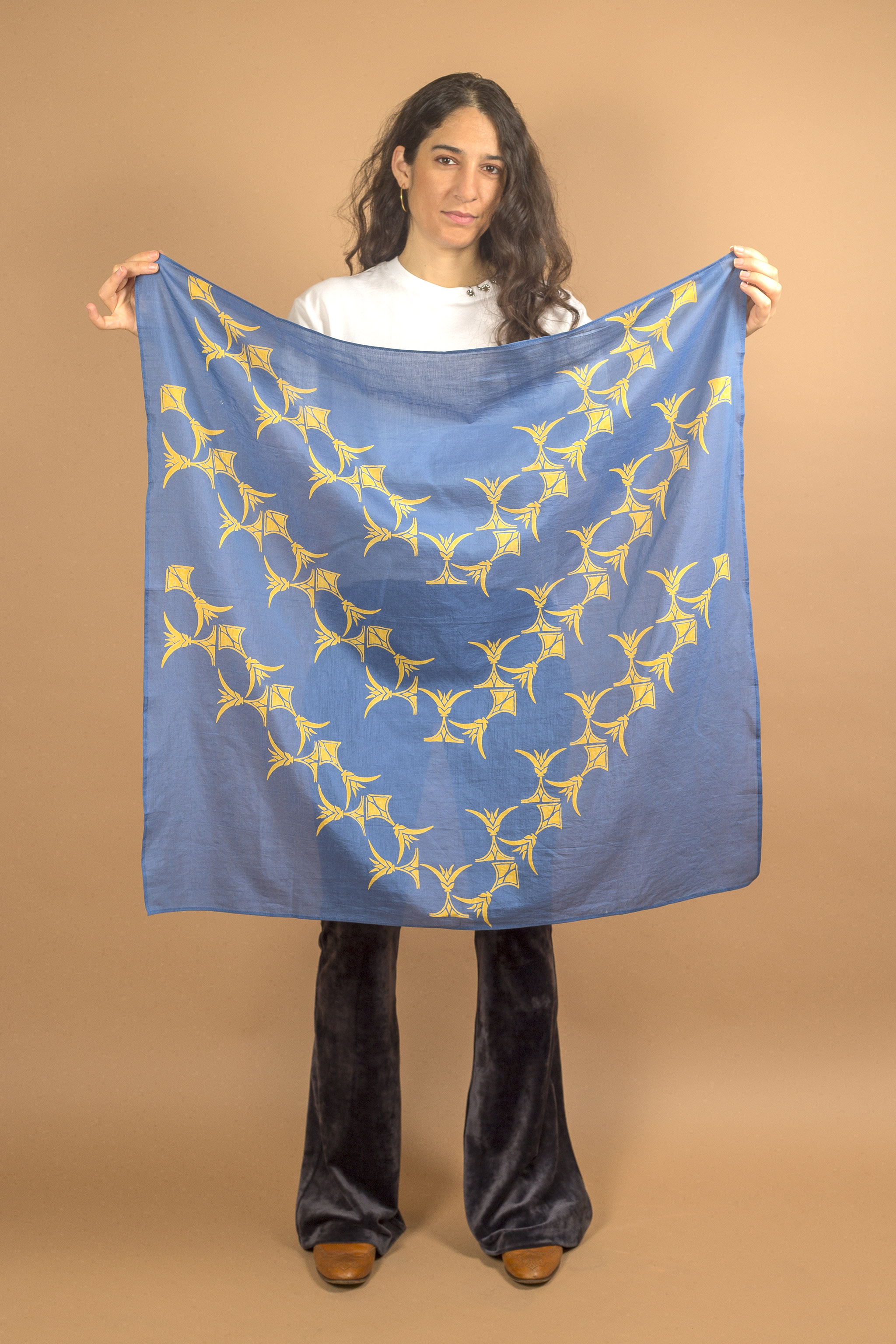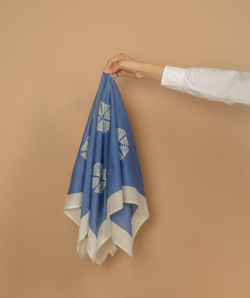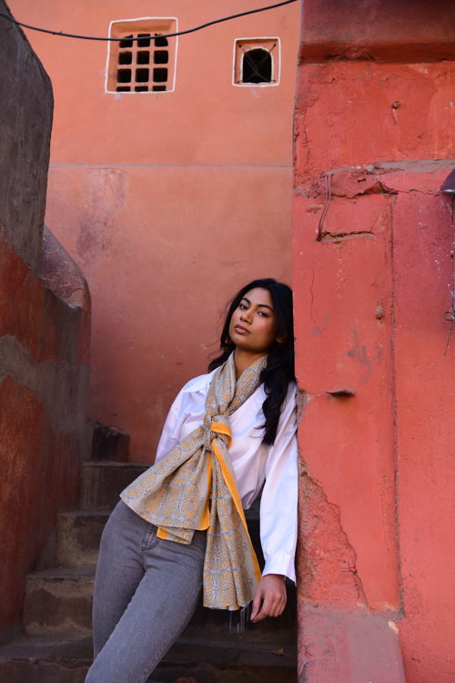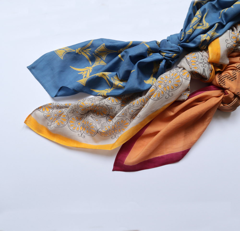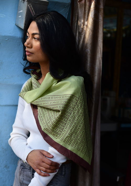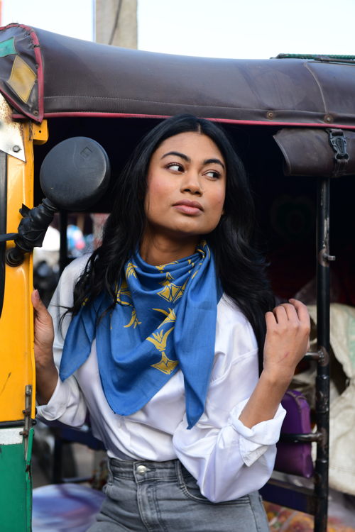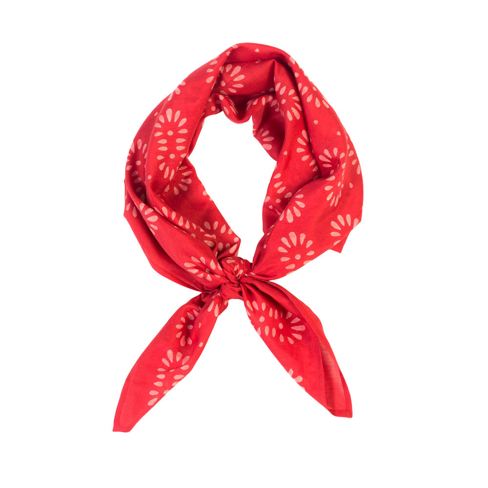 De sjaals worden met de hand block printed in Rajasthan en zijn gemaakt van een zachte silk-cotton blend (55% zijde, 45% katoen). Met een formaat van ongeveer 86 x 86 cm zijn ze veelzijdig te stylen: los rond de hals, nonchalant over de schouders, in het haar of als subtiel accent aan een tas.