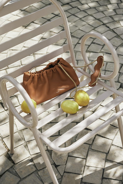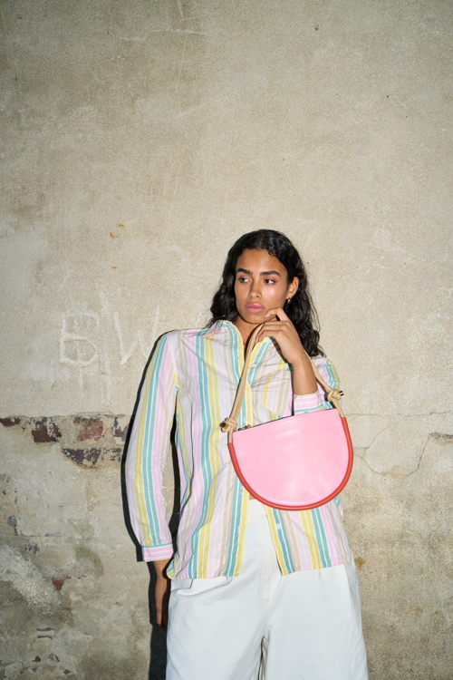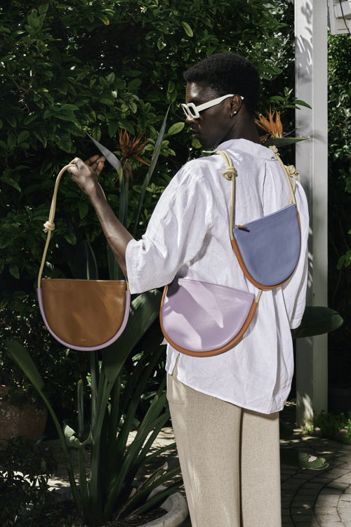 Binti, gevestigd in het Antwerpse modedistrict, combineert Afrikaanse en Europese labels met hun eigen kleding- en accessoiremerk. Voor de lente staan de tassen van het Zuid-Afrikaanse label PROJECT DYAD centraal: compact maar verrassend ruim, van soepel koeienleder met een kenmerkende ruche aan de bovenkant. De verstelbare schouderriem in sailing rope voegt een grafisch contrast toe en past bij de zachte, moderne lentekleuren lila, poederblauw en warm bruin.