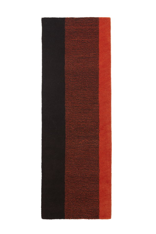 Les tapis en laine sont disponibles en quatre combinaisons de couleurs vives : bleu cobalt & écru, vert & lilas, orange coquelicot & marron, et bleu ciel & bordeaux. Chaque combinaison comporte trois couleurs, les deux couleurs principales fusionnant au centre avec une troisième couleur. Développées en harmonie avec la collection de linge de lit, les combinaisons de couleurs des tapis viennent créer un ensemble cohérent. Chaque combinaison est disponible dans deux motifs : avec des rayures verticales ou horizontales.